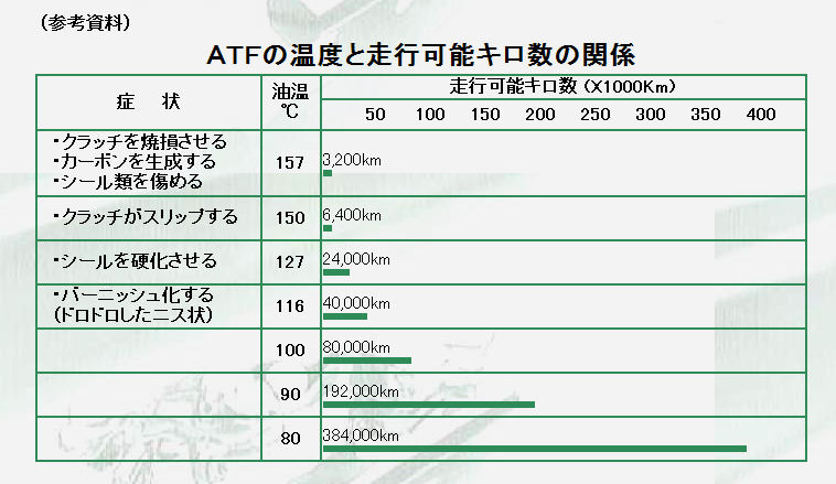 参考までに私が入手したATFの温度と走行可能距離に関するテストデーターを表にしてみました、下記アドレスからご覧下さい。
